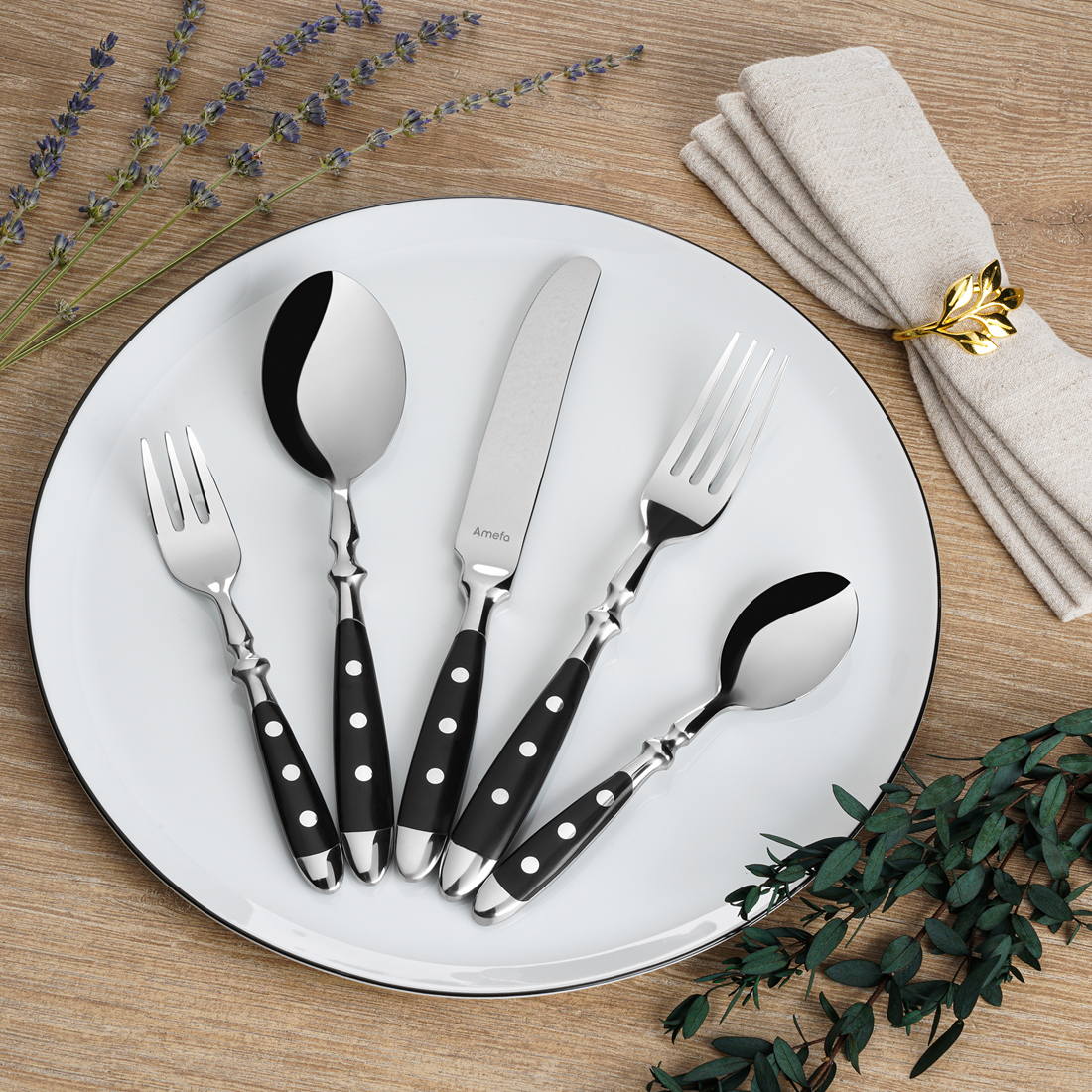 Sztućce w stylu vintage, z czarnymi nitowanymi rękojeściami. Nie polecamy do zmywarek.