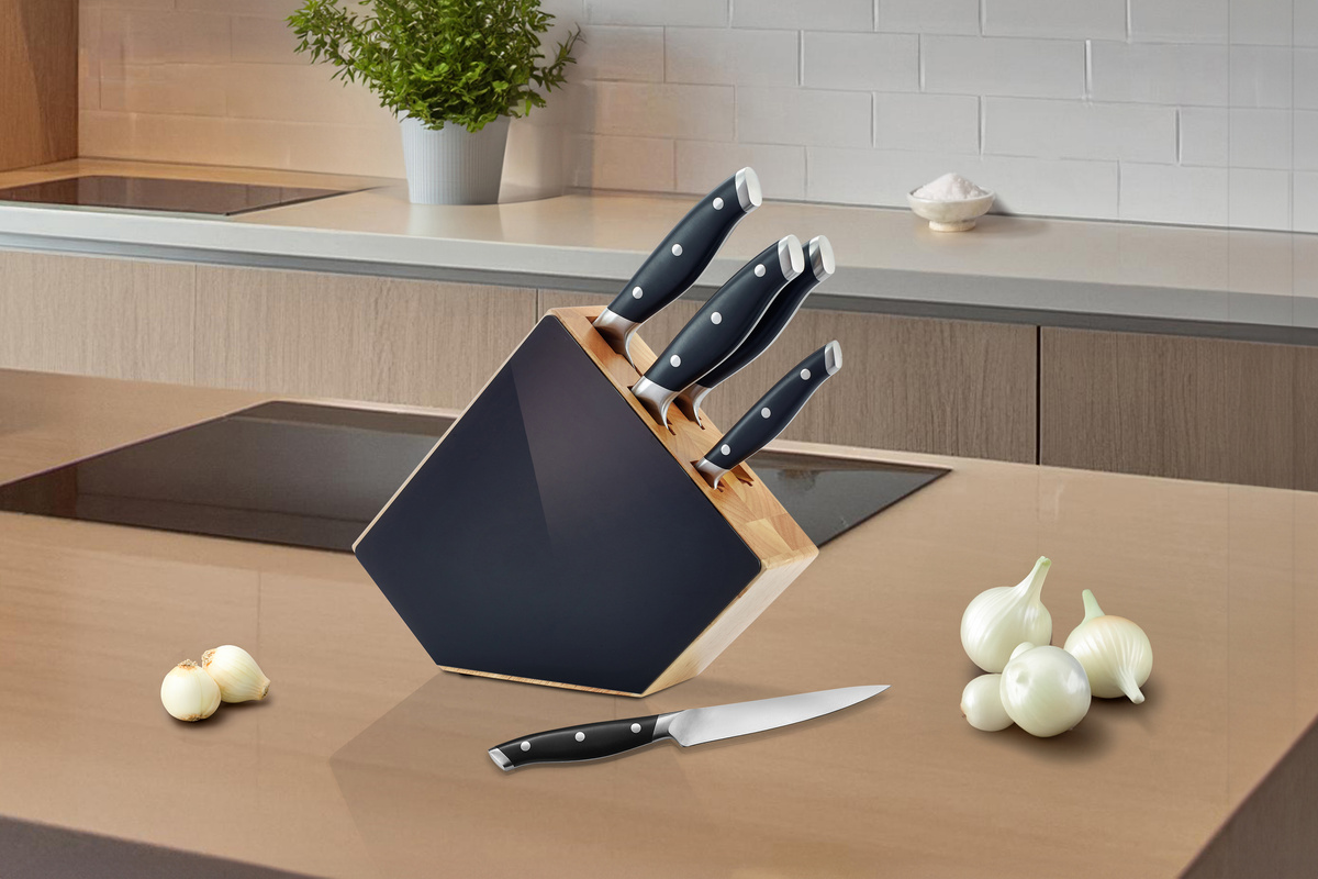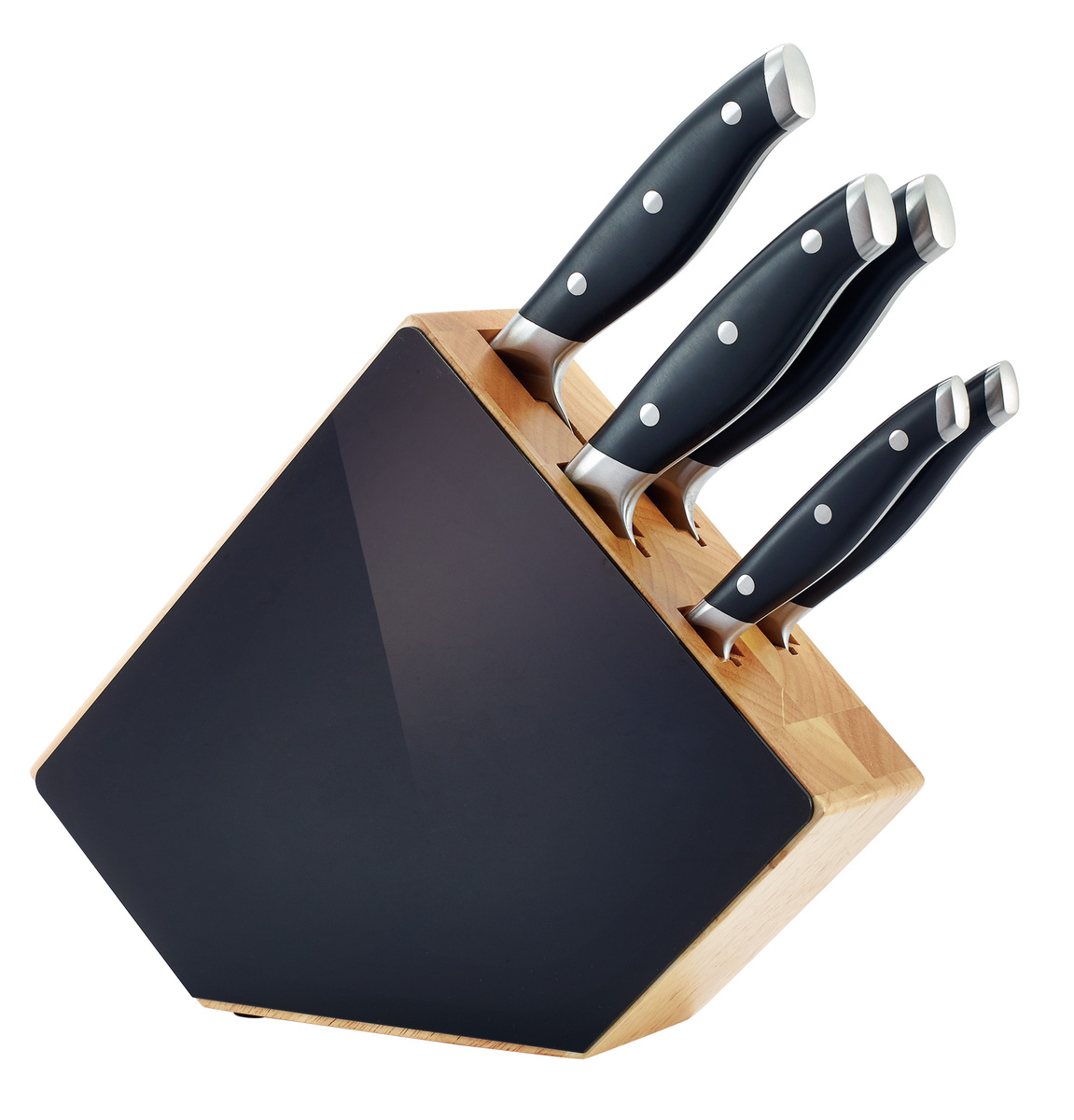 Blok na noże Grand Chef to połączenie estetyki i praktyczności. Jego dwumateriałowa konstrukcja tworzy jednocześnie elegancką i mocną formę. Zastosowanie wytrzymałych materiałów i opływowy kształt noży sprawiają, że przygotowywanie posiłków to czysta przyjemność. Zawiera wszystkie noże potrzebne do bezproblemowego przygotowania potraw. Ten zestaw eleganckich noży zapewni Ci optymalne i wygodne krojenie.