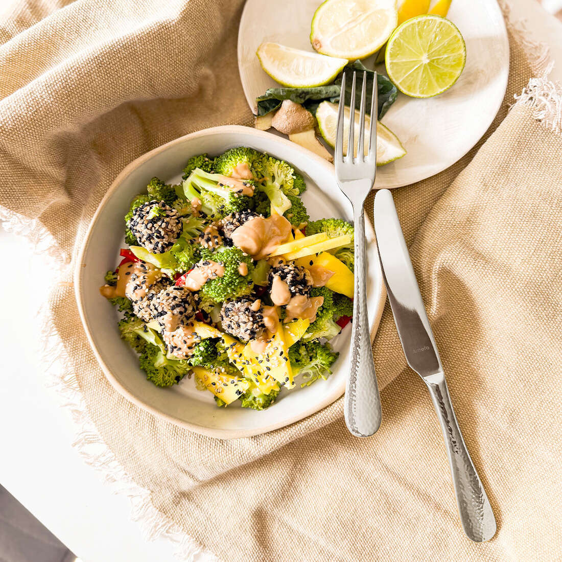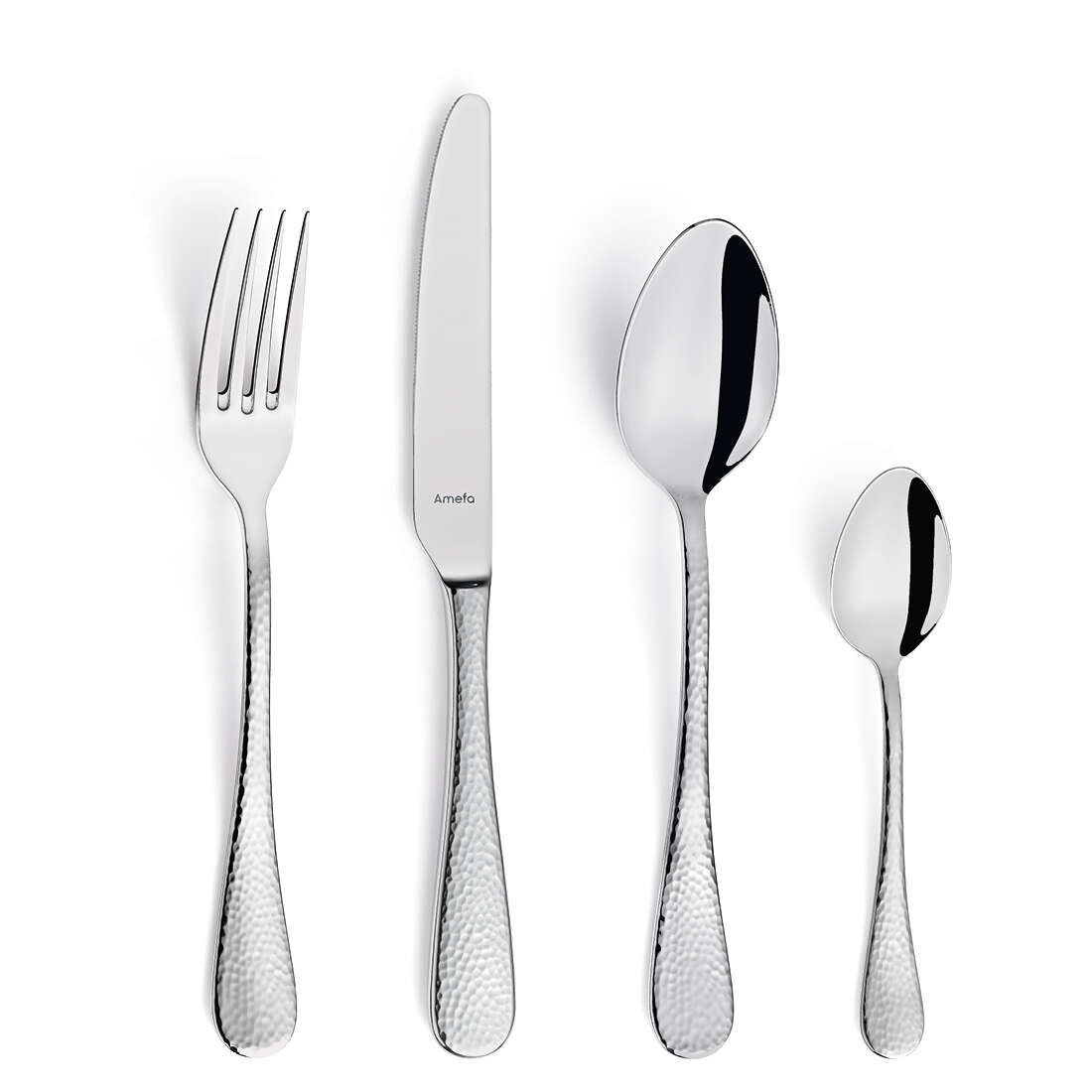 Młotkowane sztućce wykonane z hartowanej stali. Model z zaokrąglonymi końcami rękojeści. Idealny do użytku profesjonalnego.