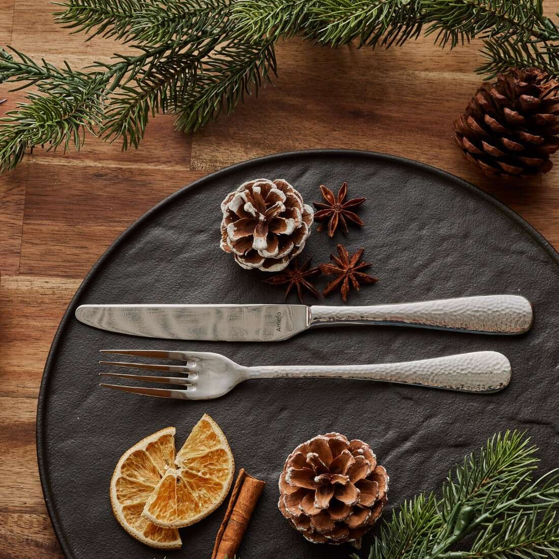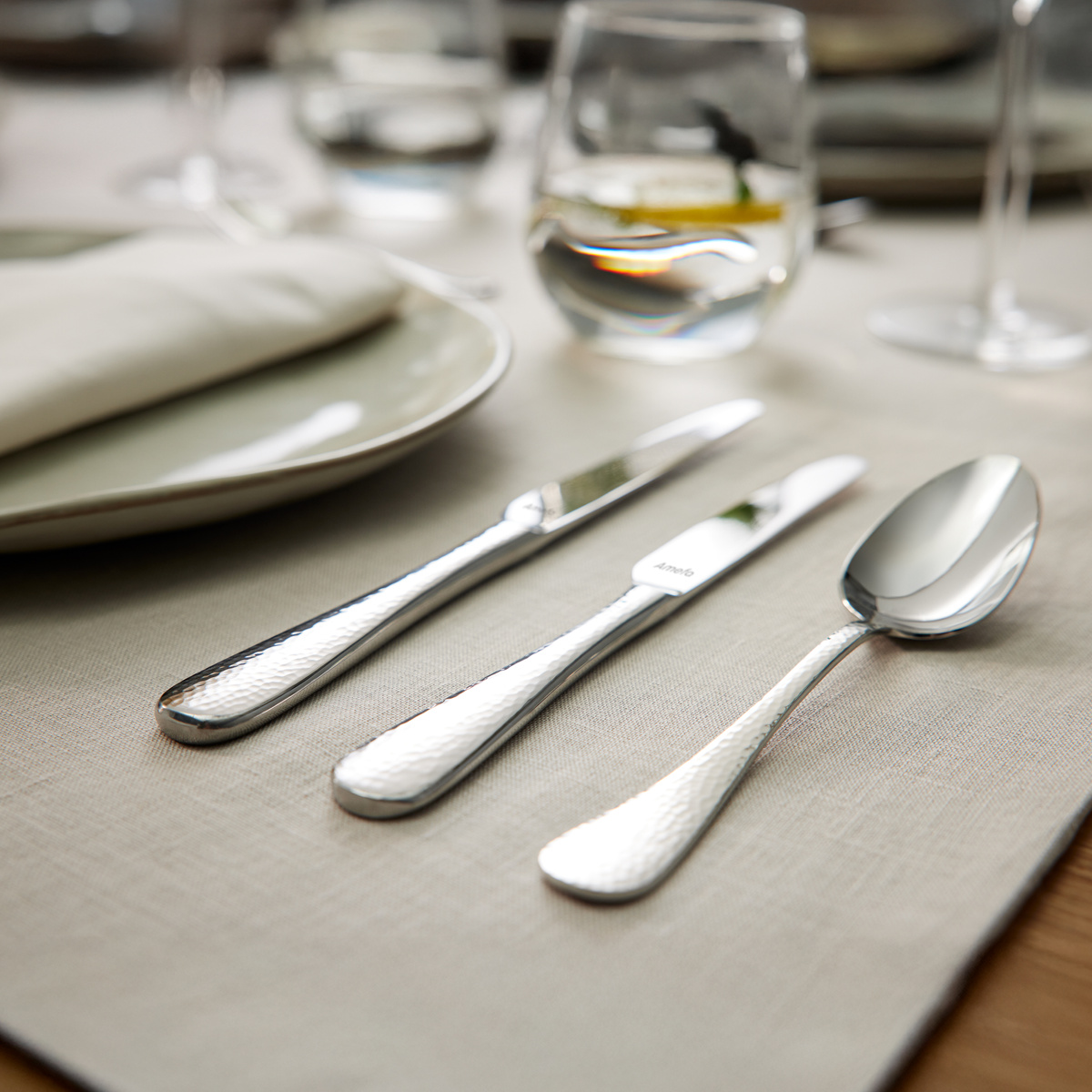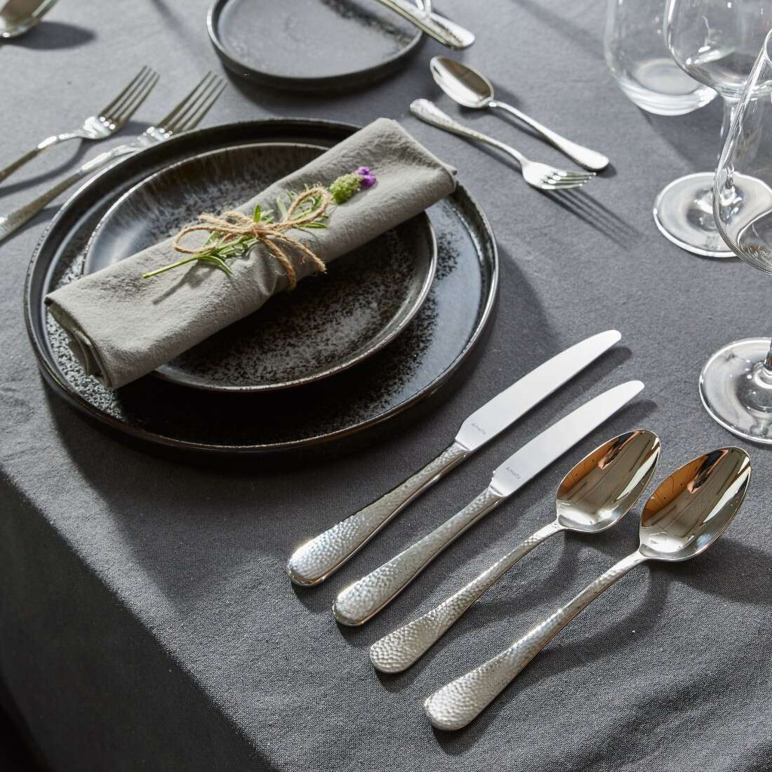 Młotkowane sztućce wykonane z hartowanej stali. Model z zaokrąglonymi końcami rękojeści. Idealny do użytku profesjonalnego i domowego.