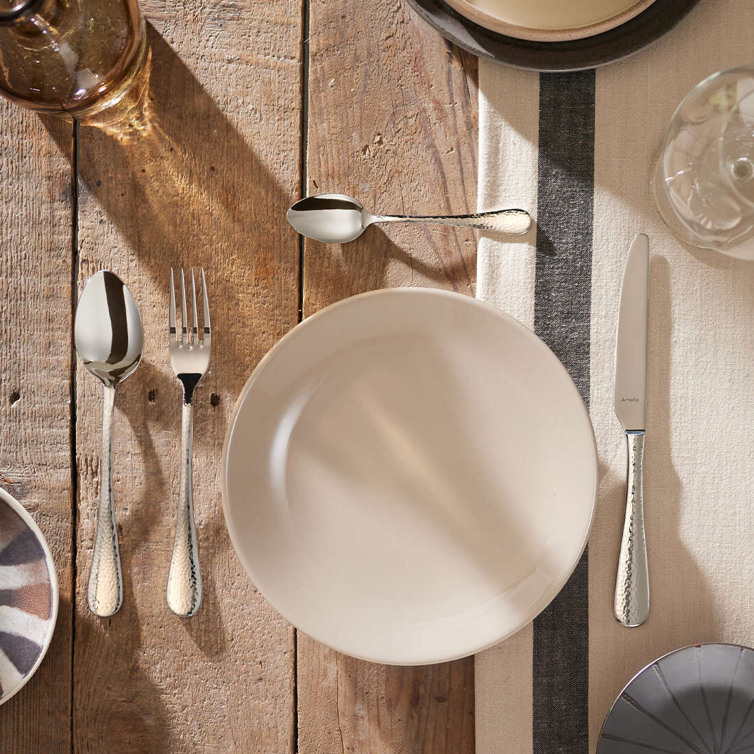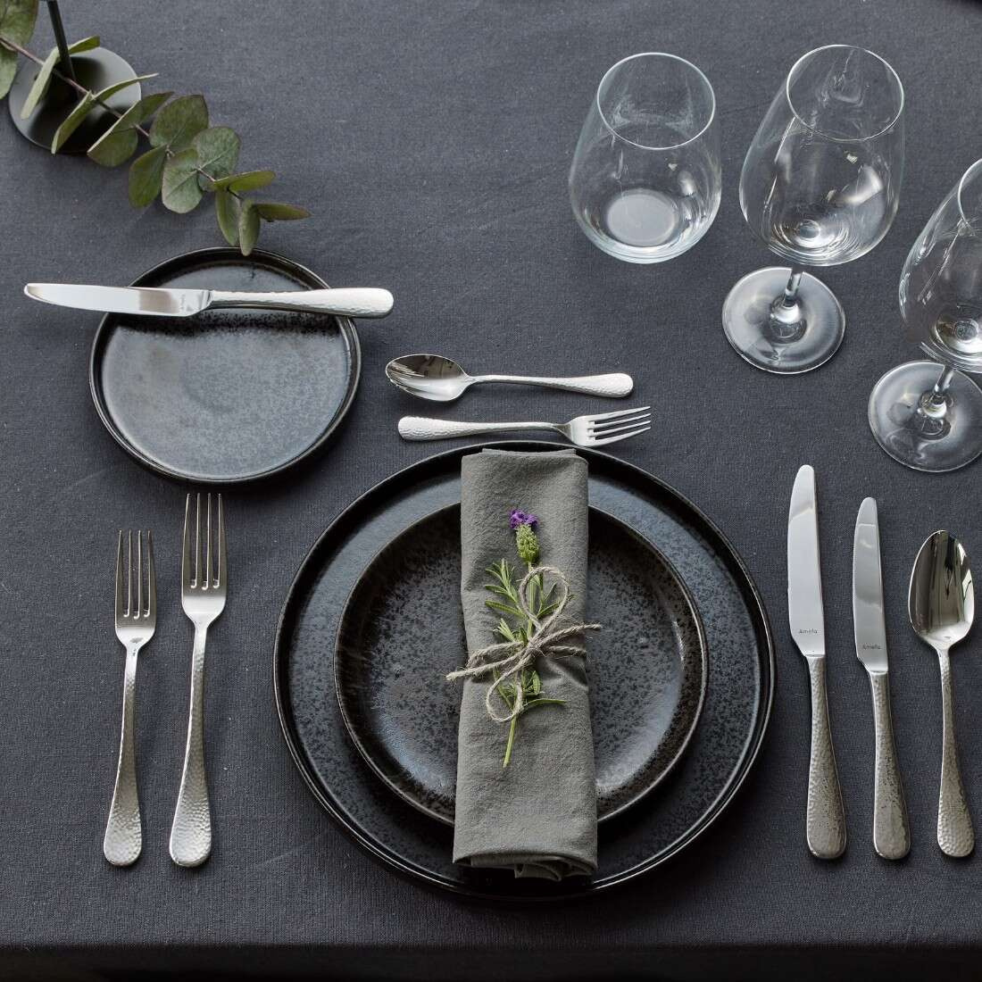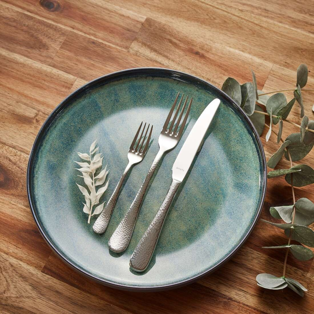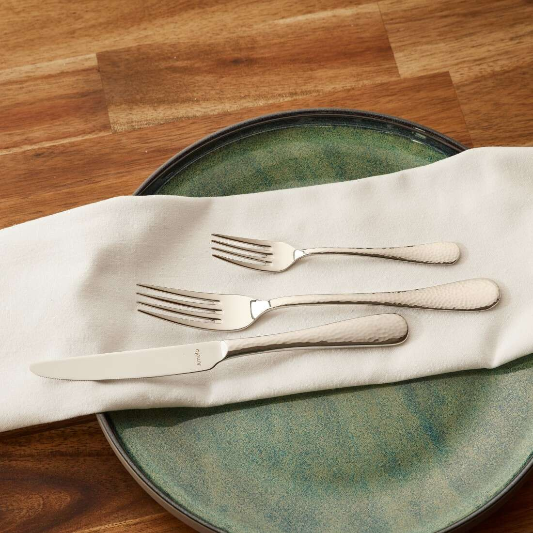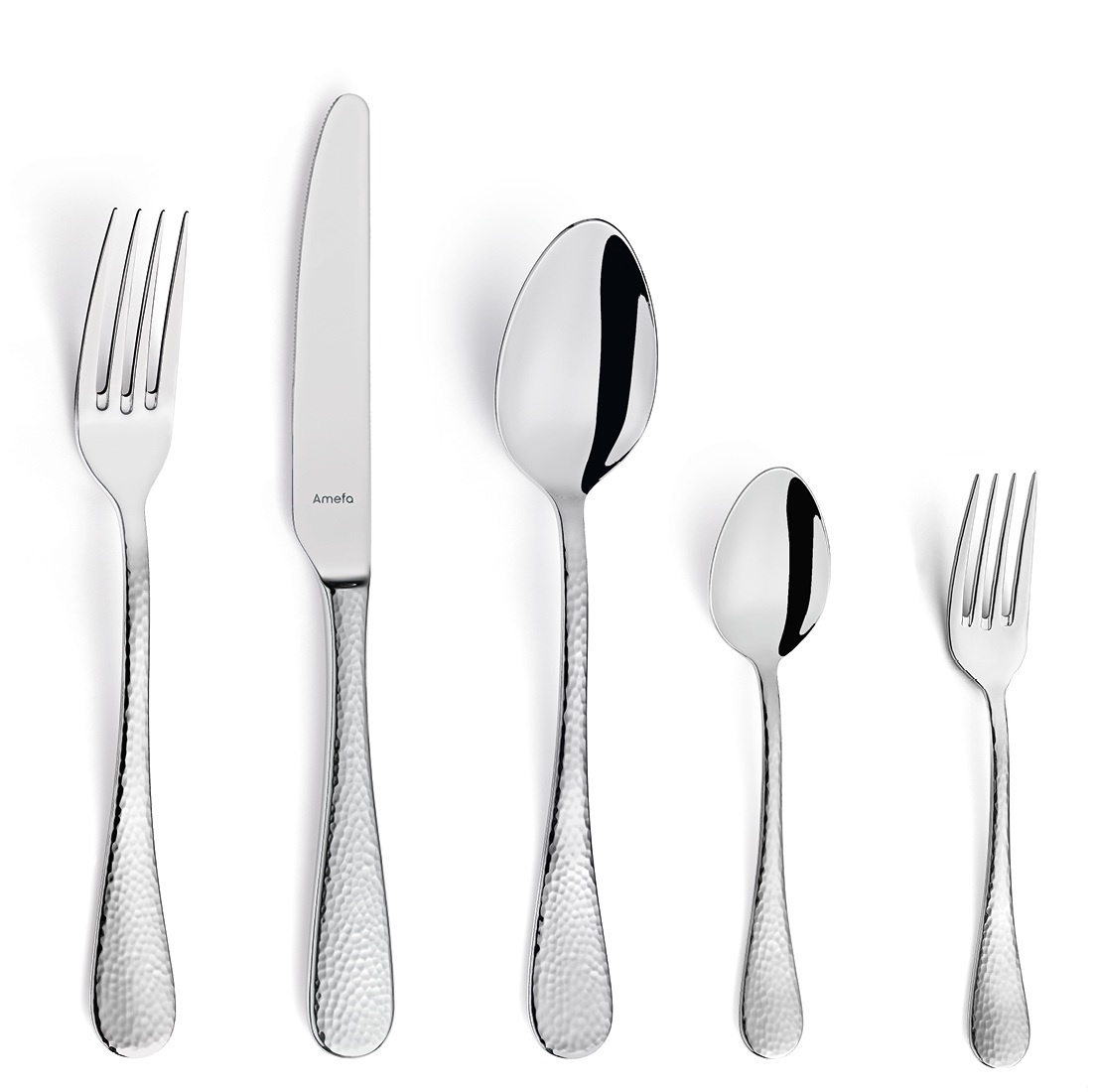 Młotkowane sztućce wykonane z hartowanej stali. Model z zaokrąglonymi końcami rękojeści. Idealny do użytku profesjonalnego i domowego.