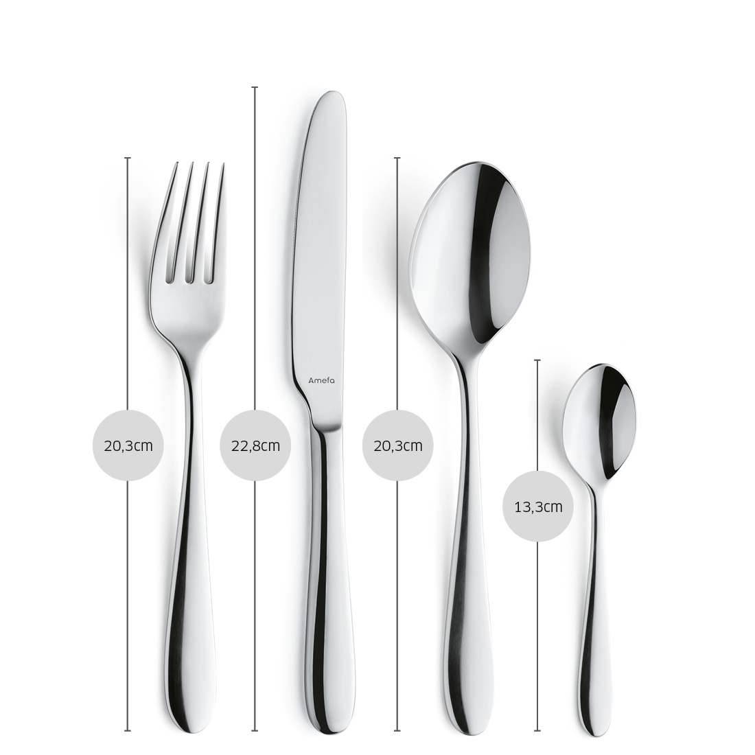 Ekskluzywne sztućce z kolekcji Amefa Premiere. Najwyższa jakości stali nierdzewnej 18/10, przepięknie wykończone, będą służyć przez długie lata.Osobliwie zaprojektowane z unikatowym i niespotykanym smakiem. Nowoczesna forma i kształt - to jest zastawa z silną osobowością. Sztućce polerowane.