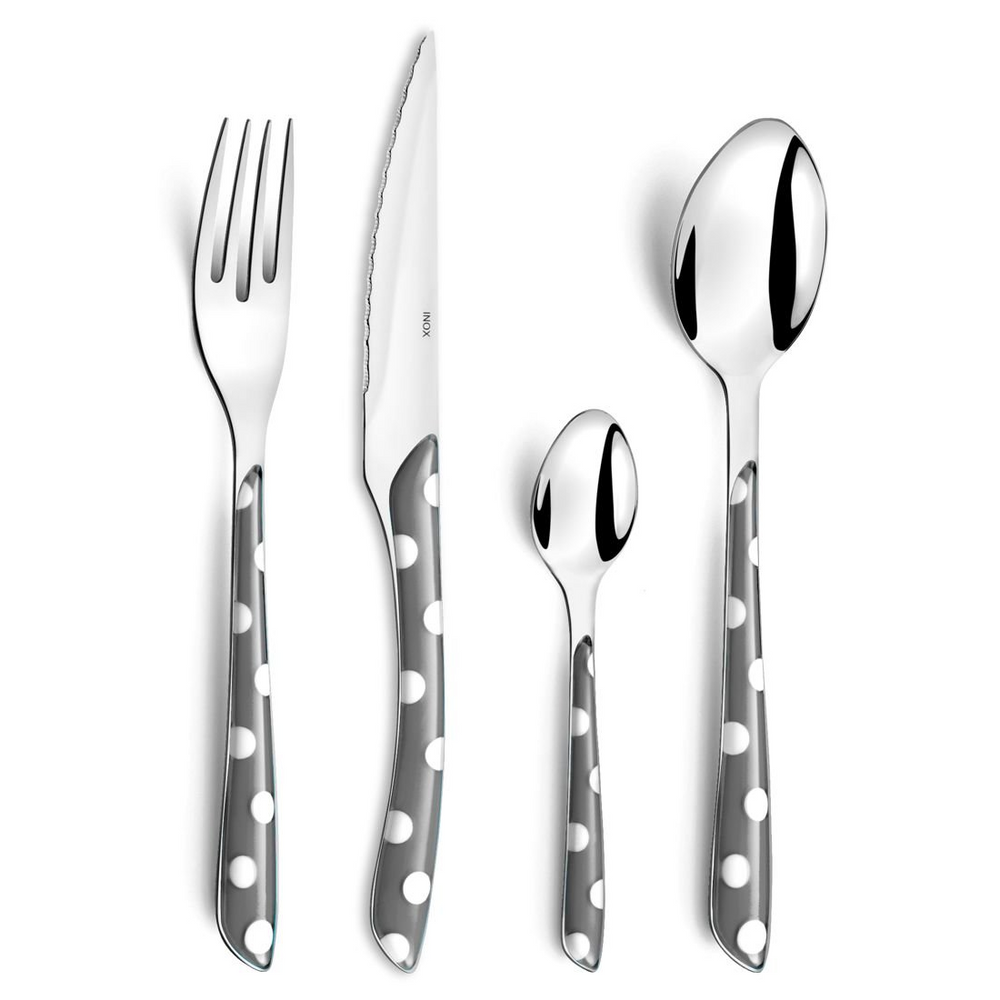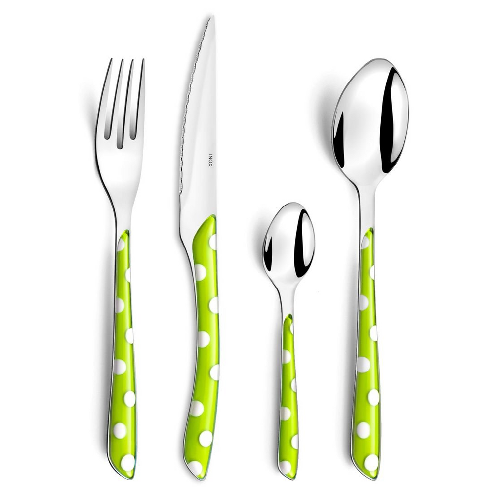 Nowoczesne, barwne sztućce z tej serii doskonale nadają się zarówno do wyposażenia mieszkania, jak i na ciekawy prezent. Można się nimi wygodnie posługiwać, jako że są specjalnie profilowane. Model sztućców Eclat nadaje się do mycia w zmywarce, o ile spełnione zostaną podstawowe zasady – wszystkie informacje na ten temat można znaleźć w instrukcji obsługi dołączonej do zestawu. Sztućce są dostępne zarówno w wersji z rączkami w jednym kolorze, jak też i w opcji kolorowej, z białymi, ozdobnymi kropkami.